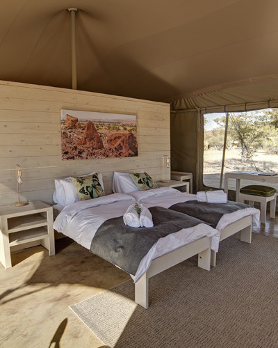 Das Malansrus Tented Camp, in der Nähe des UNESCO-Weltkulturerbes Twyfelfontein gelegen, bietet Ihnen ein aufregendes Zelt-Erlebnis in der Region Damaraland. Übernachten Sie im Schatten von Mopane-Bäumen in komfortablen Zelten mit eigenem Bad. Die bodentiefen Panoramafenster der Zelte sind mit Moskitonetzen versehen und bieten einen Blick auf die massiven Granitfelsen der Umgebung. Die miesten modernen Annehmlichkeiten, wie fließendes Wasser und ein begrenzter Zugang zu Strom stehen Ihnen zur Verfügung. Freuen Sie sich über WLAN im Hauptbereich des Lagers. Beobachten Sie von Ihrem Zelt aus die Gebirgszüge in der Ferne. Faulenzen Sie am Wasserloch in der Nähe und erhalten Sie spannende Einblicke in die Tier- und Vogelwelt der Region. Das Camp organisiert verschiedene geführte Ausflüge in die nähere und weitere Umgebung. Nippen Sie nach einer spannenden Pirschfahrt oder Besichtigungstour an einem erfrischenden Sundowner im Bar- und Lounge-Bereich oder auf der schattigen Außenterrasse. Genießen Sie im großen Zelt ein köstliches Abendessen, bevor Sie am Lagerfeuer Safari-Geschichten mit anderen Reisenden austauschen und die unzähligen Sterne am namibischen Nachthimmel beobachten.