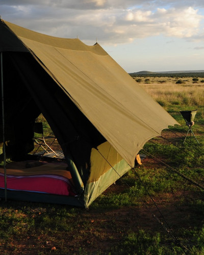 Besuchen Sie das Karisia Classic Mobile Camp und schlafen Sie unter dem majestätischen Sternenhimmel Afrikas. Die komfortablen Zelte der Marke Kodiak Canvas sind mit Bettzeug, Kissen, einem Tisch samt Spiegel sowie Wasser und einer Solarleuchte ausgestattet. Teppiche und ein Hocker runden die gemütliche Ausstattung ab. Gemeinschaftstoiletten und Duschen befinden sich hinter Ihrem Zelt. Kommen Sie nach einer aufregenden Buschwanderung in den Genuss einer warmen Eimerdusche im Safari-Stil. Zum Frühstück werden Obst, Müsli und Eier gereicht, während es zum Mittagessen meist Salate, Pizza und frische Früchte gibt. Freuen Sie sich abends auf ein Drei-Gänge-Menü im Schein von Kerzen und Laternen. Ein großes Spanndach schützt vor regnerischem Wetter. Erfrischen Sie sich mit Bier, Wein oder Spirituosen. Ihnen stehen indigene Guides zur Seite, während das schwere Gepäck von Kamelen transportiert wird.