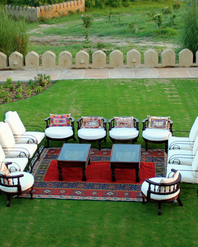 Das palastartige Boutique-Hotel Mihirgarh oder ‚Sonnenfestung‘ liegt am Rande der Wüste und verfügt über einen beeindruckenden Stall echter Marwari-Rösser. Hier, südlich der Wüstenwildnis von Jodhpur, lernen Gäste die bunten, ländlichen Traditionen und die legendäre Gastfreundschaft Rajasthans kennen. Im Hotel mischt sich unaufdringlicher Luxus mit rustikaler Eleganz. Es verfügt über neun jeweils 158 Quadratmeter große Suiten mit Blick auf Sonnenauf- oder -Untergang, drei Innenhöfe, einen spektakulären Infinity-Pool, mehrere Lounges und Bars, einen Dining Room und eine Barbecue-Terrasse. Die Erdgeschoss-Suiten haben einen eigenen Hof mit Mini-Pool, während die Suiten im Obergeschoss mit Terrasse und Jacuzzi ausgestattet sind.