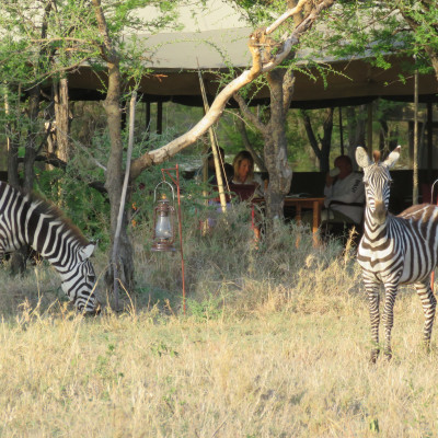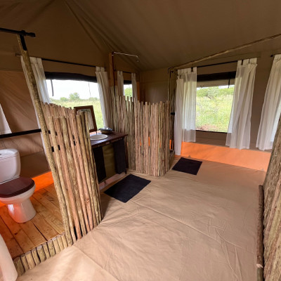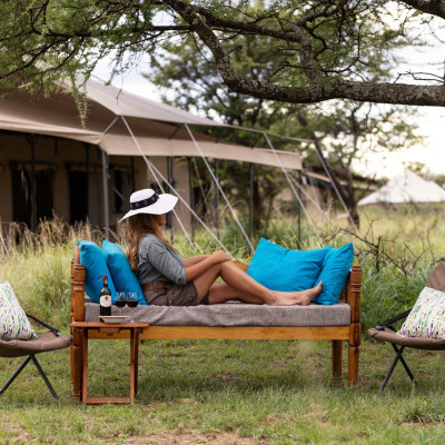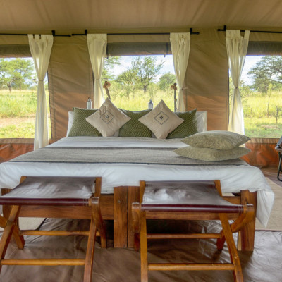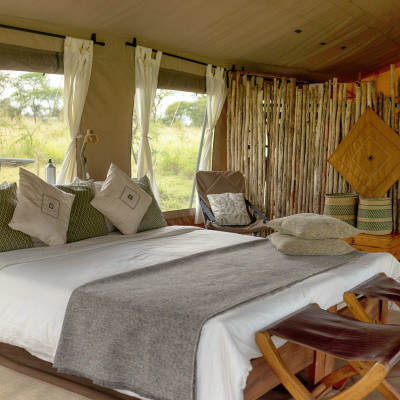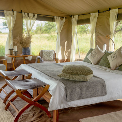 Das umweltfreundliche Serengeti Wilderness Camp liegt bei Turner’s Springs im Osten der zentralen Seronera-Region, eingebettet in die weiten Serengeti-Ebenen mit ihrem Reichtum an Wildtieren. Von diesem Zelt-Buschcamp aus erreichen Sie nach kurzer Fahrt Gebiete, in denen viele Löwen und Leoparden leben. Besonders eindrückliche Wildbeobachtungen das ganze Jahr über sind daher die Regel. Die geräumigen, gut ausgestatteten Canvaszelte sind mit bequemen Betten, hochwertiger Bettwäsche und solarbetriebenen Nachttischlampen ausgestattet. Die privaten Badezimmer verfügen über eine Buschdusche und Toiletten mit Wasserspülung. Jedes Zelt hat eine eigene schattige Veranda, die zum Entspannen, Vogelbeobachten oder Lesen einlädt. Am abendlichen Lagerfeuer tauschen Sie sich bei Sundownern und Snacks mit den anderen Gästen über die Safarierlebnisse des Tages aus. Ein komfortables Lounge-Zelt beherbergt eine Bibliothek und Lademöglichkeiten für elektronische Geräte. Im zentralen Speisezelt werden Sie mit reichhaltigen Mahlzeiten verwöhnt, gepaart mit einer Auswahl an feinen Weinen und Spirituosen. Bei passenden Wetterverhältnissen können sie diese auch unter dem funkelnden Sternenhimmel genießen.