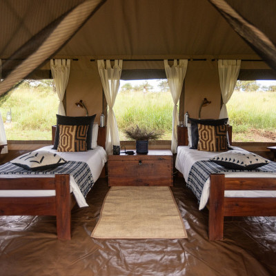 Das kleine, familiär anmutende Nasikia Central Camp verfügt über 10 semi-permanente Zelte, die mit großen Betten und Moskitonetzen, einem Schreibtisch mit Stuhl und einem Schrank ausgestattet sind.