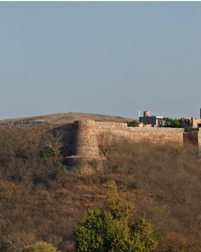 Mächtig und stolz ragen die Mauern des Ramathra Forts über die Ebene des gleichnamigen Dorfes in der Nähe des Ranthambore-Nationalparks.