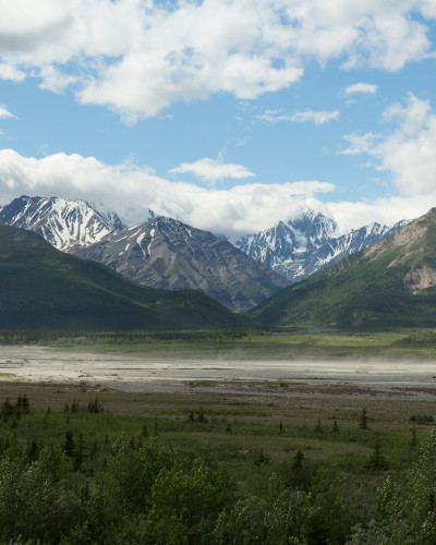 Black Rapids is located 38 miles south of Delta Junction. Set amid the untamed wilderness of the Alaska Range, this area features rugged, snow-capped mountains, rivers and creeks. This remote, stunningly scenic corner of the Alaskan interior has an impressive range of hiking trails. Short walks above the tree line offer panoramic views of mountain valleys and the Delta River, while Alpine treks include explorations of glacier caves. Angling enthusiasts can enjoy the many fishing spots brimming with trout, northern pike and Arctic char. Canoeing and kayaking are available on Black Rapids Lake.