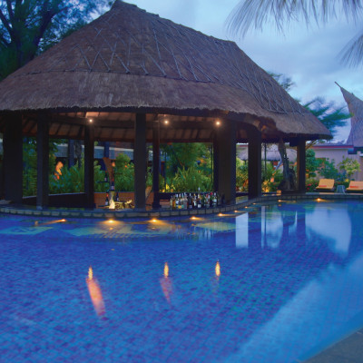 Aston Sunset Beach Resort – Gili Trawangan is set amid tropical gardens in the tranquil western region of the island. Rest in one of 114 modern en suite rooms that feature contemporary amenities expected at an upscale property. Many a room is equipped with a private balcony or terrace that overlooks the garden or swimming pool area. If it’s privacy you’re after, opt for one of ten secluded villas that are neatly hidden away from visitors. Enjoy a relaxing day at the deluxe spa and spend your evenings on the sunset desk enjoying a tranquil sundowner. For a touch of adventure, explore the beautiful island, or dive into the ocean to see colorful marine life. At mealtimes, choose between Indonesian and international cuisine from the restaurant, or sample fresh seafood that is grilled to perfection at the bar.