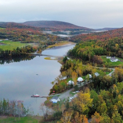 Northeast Cove Geodomes sits on the shores of Bras d’Or Lake in Mabou, Nova Scotia. This upper mid-range camp offers a cozy glamping experience in the midst of the natural beauty of Cape Breton Island. Each geodesic dome features stylish interiors and is equipped with air conditioning, a kitchenette, and a private bathroom. Large bay windows let in plenty of light. Enjoy your morning coffee on your spacious deck and soak up the panoramic views of your surroundings. Go swimming or kayaking in the lake, which is right outside the domes. At night, spend some time stargazing through your dome’s skylight and see how many constellations you can identify. The geodomes are also walking distance from the village’s pubs and restaurants. There are a number of biking and hiking trails nearby as well, while Cabot Cliffs, the number one golf course in Canada, is just a short drive away.