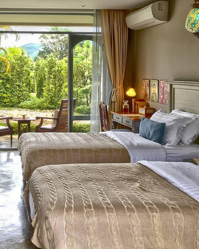 Reverie Siam is a themed resort situated on the banks of Pai river in northwestern Thailand. Nestled amid ornamental gardens, the property reflects styles of the early 20th century. Admire its delightful interiors, replete with the owners’ personal collections of antiques, collectibles, and plush vintage furniture, adding to the colonial charm. Sleep in elegant ensuite villas offering ample privacy, set in a secluded garden nearby. The airy accommodations feature stone floors, four-poster beds, spa baths, and elegant décor. Wake up to views of misty mountains around from your outdoor pavilions. Wallow in the natural pool surrounded by tall hedges, or plunge into the turquoise blue pool. Enjoy beautiful sunsets on the lounge deck, seated on beanbags by the river. Linger on at Silhouette, the library jazz bar that hosts live performances every evening. Sip on craft beers, boutique wines, and freshly pressed juices. Sample the interesting menu comprising locally grown ingredients.